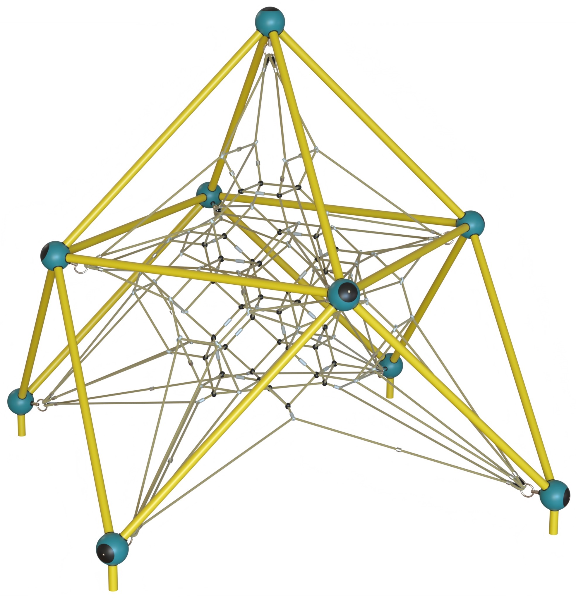 Размер 3320х3320х3490; Каркас «Сократа» выполнен из стальных сфер и перекладин. Все металлические элементы комплекса покрыты полимерным покрытием с предварительным нанесением на них цинкового грунта. Канатная часть комплекса выполнена из атмосферостойкого армированного каната. Соединения каната выполнены с применением антивандальных алюминиевых соединителей под обжим, без применения саморезов и шурупов.