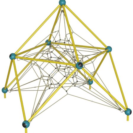 Размер 6620х4950х3000; Каркас «Сократа» выполнен из стальных сфер и перекладин. Все металлические элементы комплекса покрыты полимерным покрытием с предварительным нанесением на них цинкового грунта. В узлах стыковки сфер и перекладин для предотвращения образования коррозии установлены переходные пластиковые шайбы, препятствующие трению метала об металл.