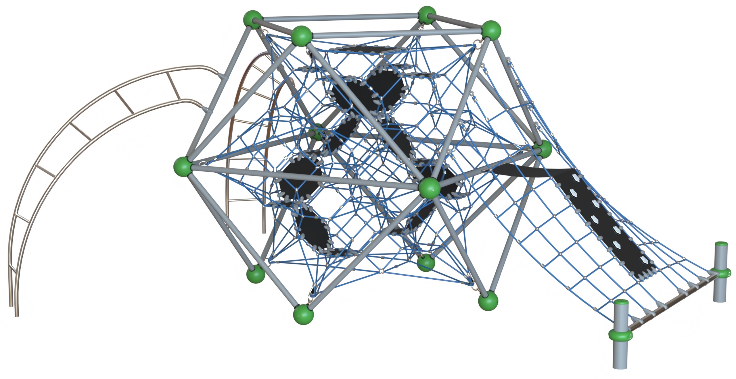В состав комплекса входят две спиральные лестницы из нержавеющие стали и канатный скалодром на армированной резиновой мембране с зацепами из HPDE пластика.