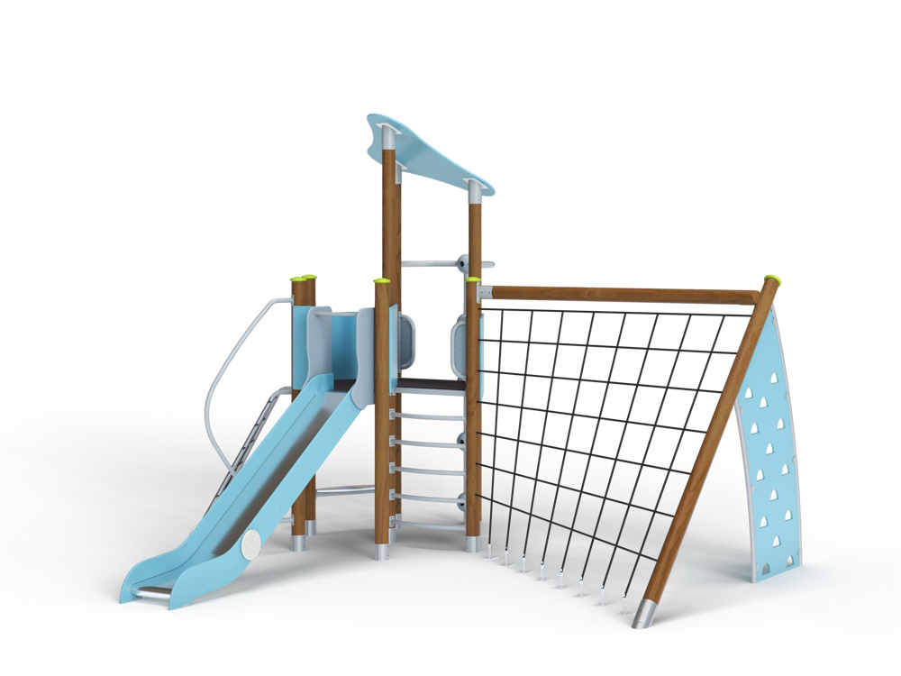 От открытого сегмента площадки идёт спортивный элемент в виде двух наклонных столбов к которым крепятся приставная альпинистская стенка и наклонная полипропиленовая сетка.