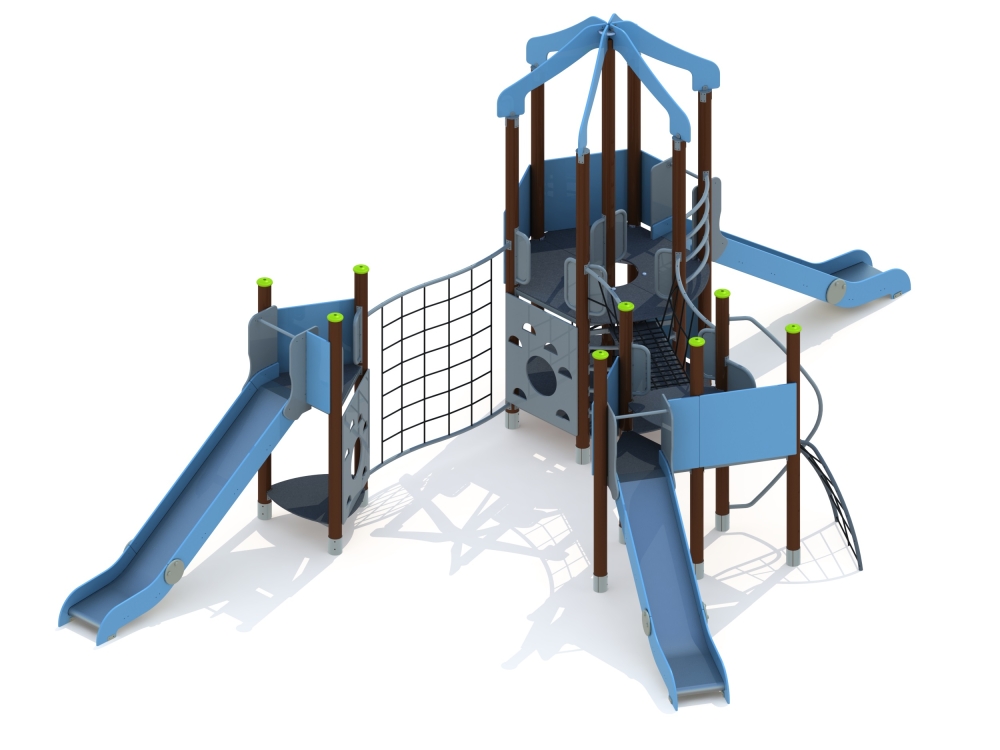 Размер 9950*5640*4150; Детский игровой комплекс с круглыми столбами состоит из трёх разновысоких башен.