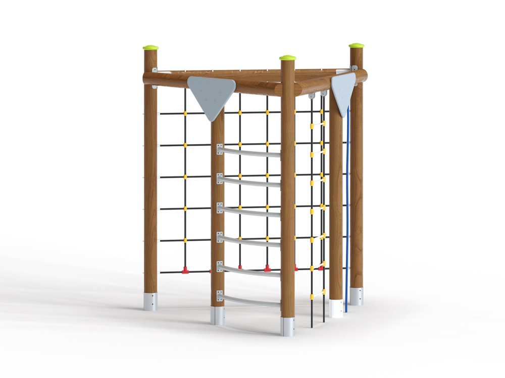 Размер 2180*1940*2520; Спортивный комплекс с круглыми столбами скомпонован в виде треугольника на котором расположены лестница полипропиленовая, сетка полипропиленовая, канат и радиусные перекладины.